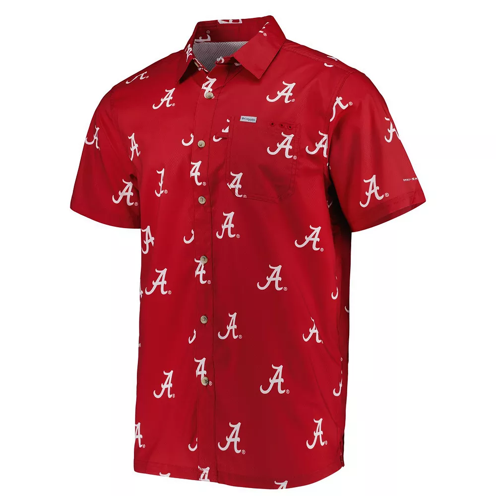 Make the most of warm weather when you wear this Alabama Crimson Tide Super Slack Tide shirt from Columbia. It features Omni-Shade technology for built-in sun protection, ventilation through the back mesh insert and a handy interior patch at the bottom for cleaning sunglasses. A repeating Alabama Crimson Tide pattern all over adds the perfect finishing touch to this eye-catching button-up.