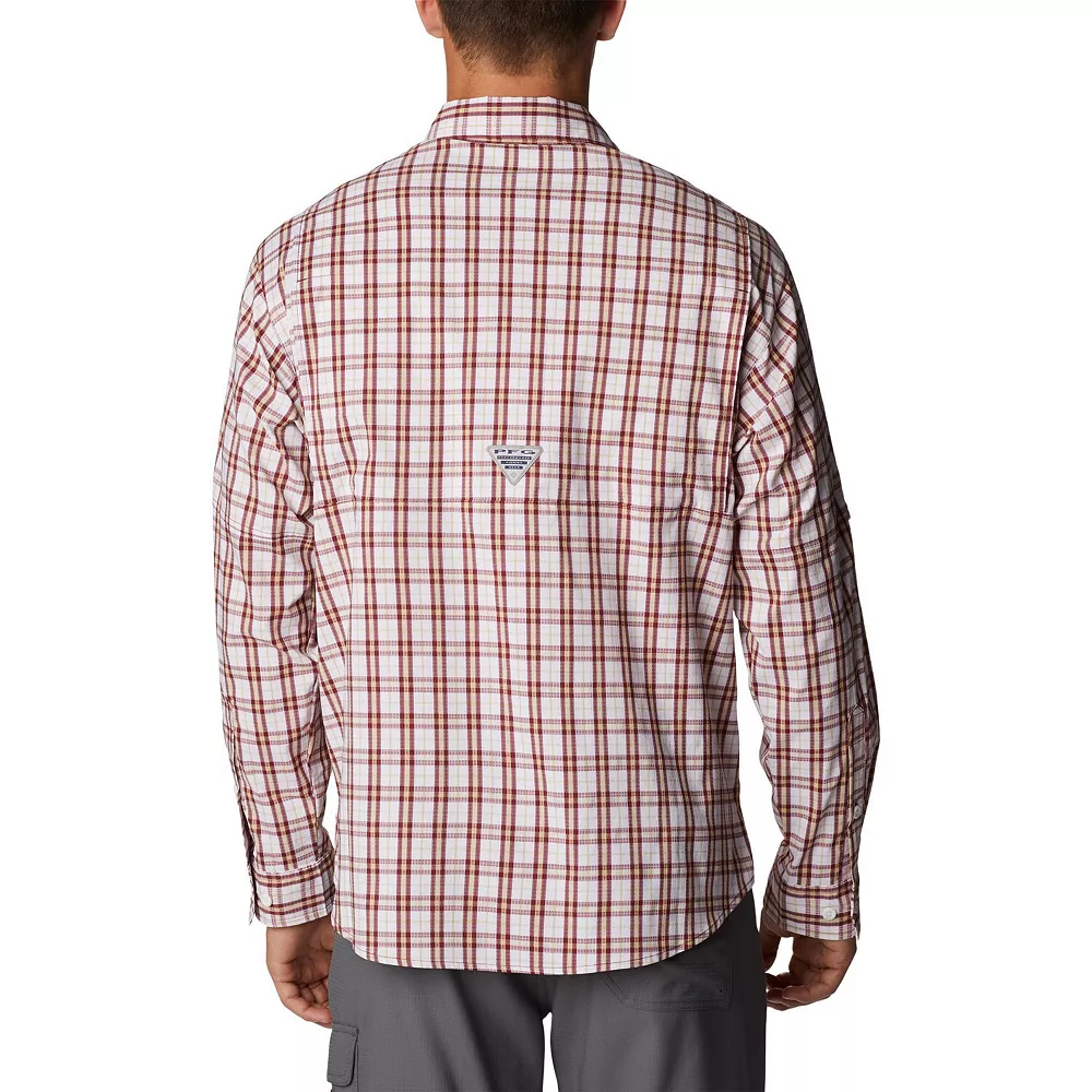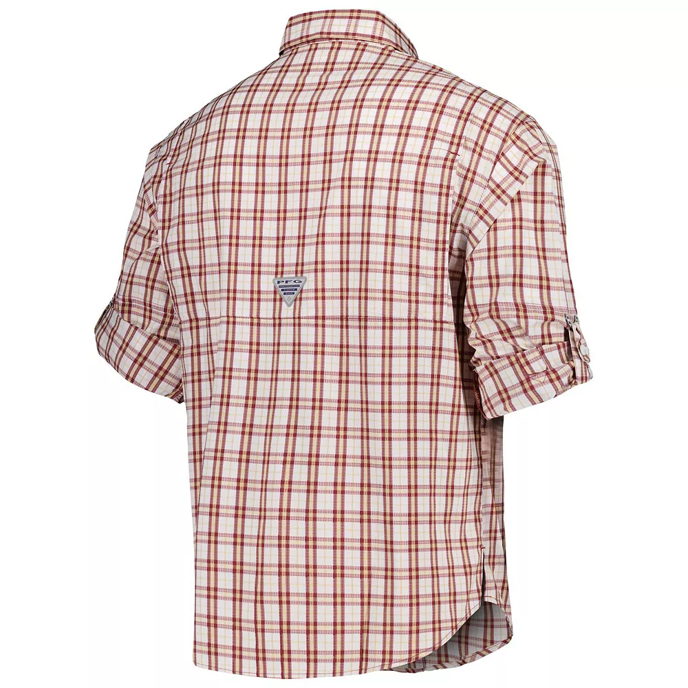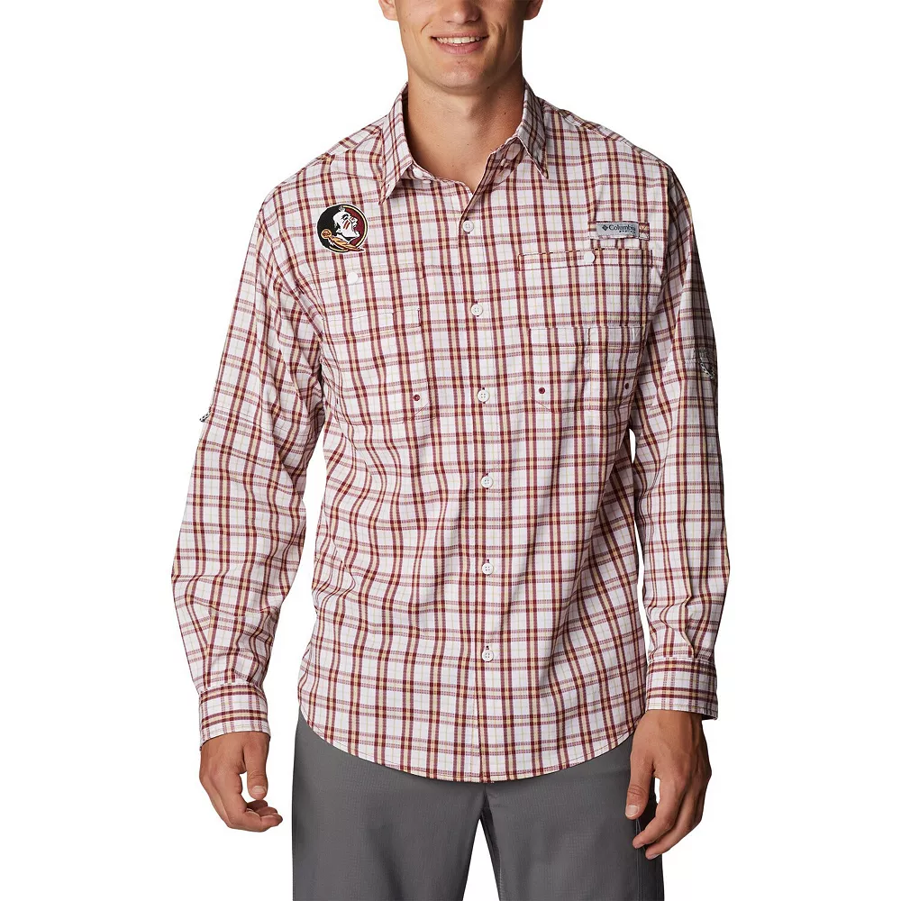 Enhance your fishing trips or outdoor adventures with the incredibly functional and comfortable Super Tamiami button-down shirt from Columbia. Featuring an embroidered Florida State Seminoles logo, it uses Omni-Shade technology to provide maximum sun protection for long hours and mesh-lined venting for a cooling breeze. Plus, a rod holder loop and multiple pockets keep your hands free. As the finishing touch, a classic gingham pattern in Florida State Seminoles colors creates a professional look.