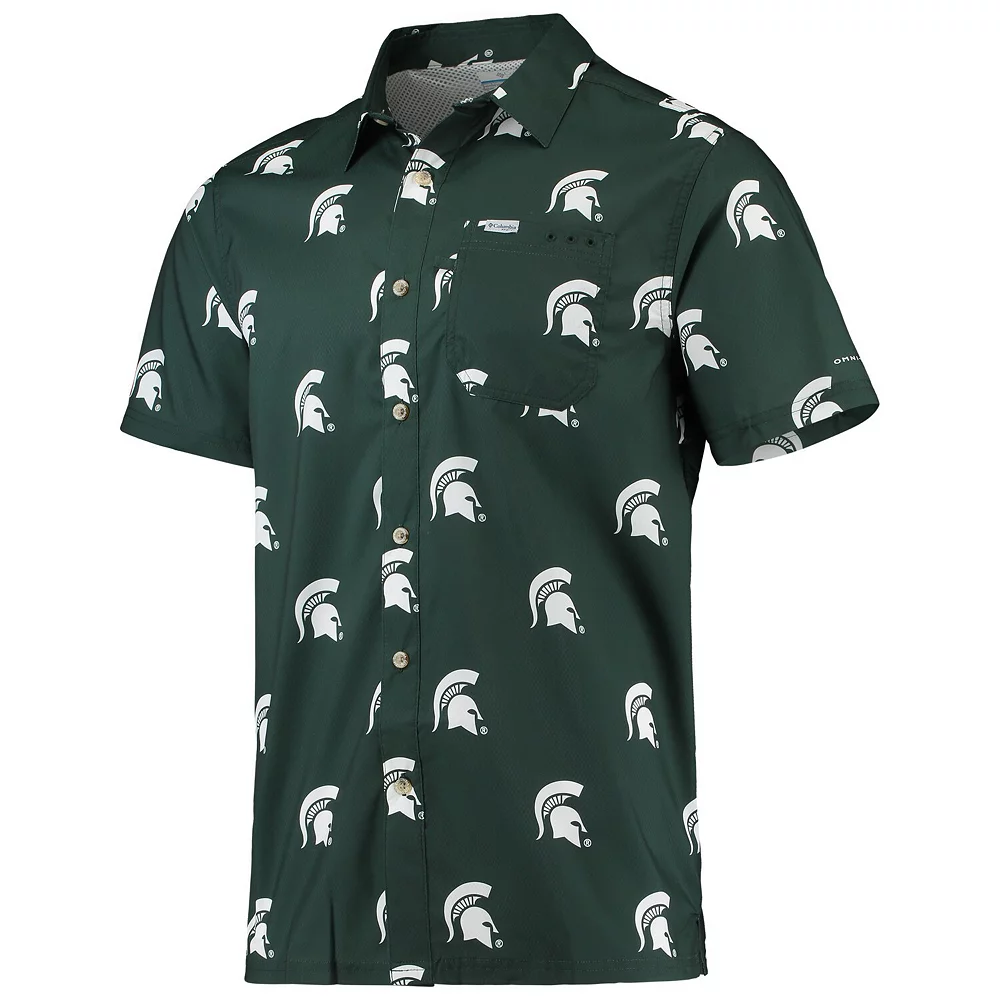 Make the most of warm weather when you wear this Michigan State Spartans Super Slack Tide shirt from Columbia. It features Omni-Shade technology for built-in sun protection, ventilation through the back mesh insert and a handy interior patch at the bottom for cleaning sunglasses. A repeating Michigan State Spartans pattern all over adds the perfect finishing touch to this eye-catching button-up.
