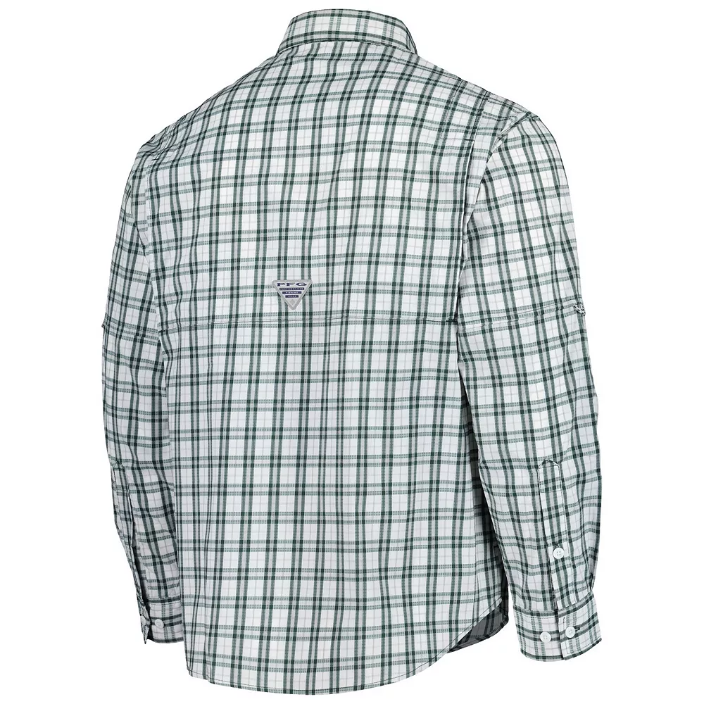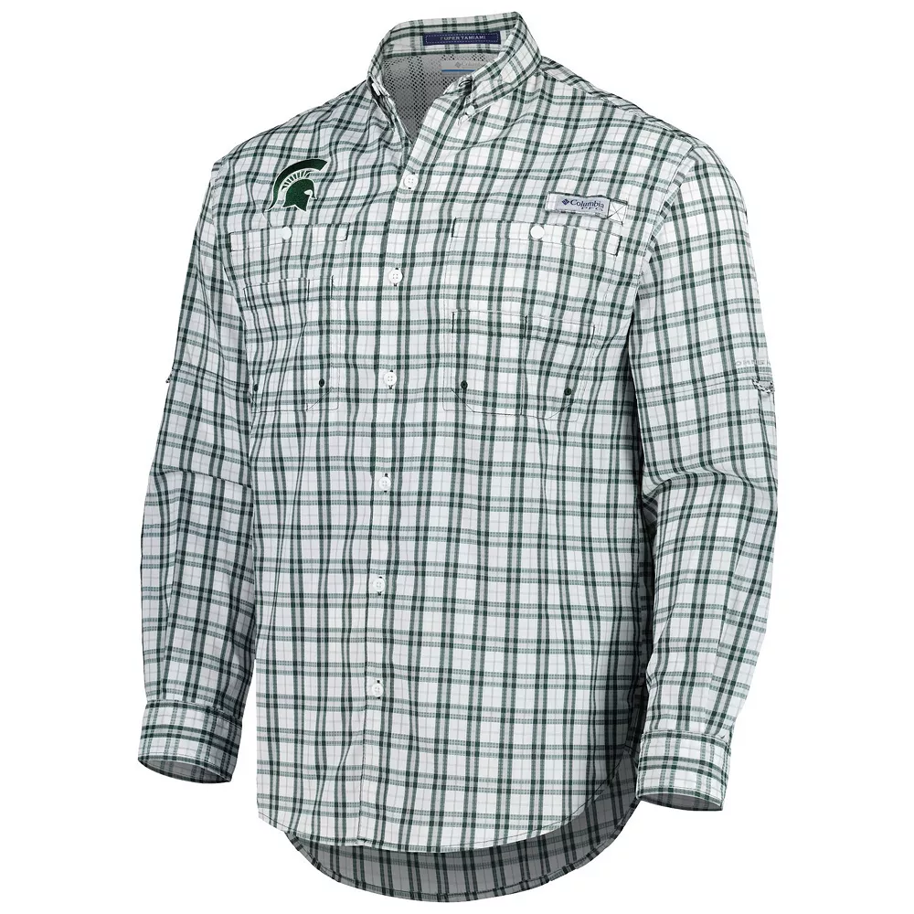 Enhance your fishing trips or outdoor adventures with the incredibly functional and comfortable Super Tamiami button-down shirt from Columbia. Featuring an embroidered Michigan State Spartans logo, it uses Omni-Shade technology to provide maximum sun protection for long hours and mesh-lined venting for a cooling breeze. Plus, a rod holder loop and multiple pockets keep your hands free. As the finishing touch, a classic gingham pattern in Michigan State Spartans colors creates a professional look.
